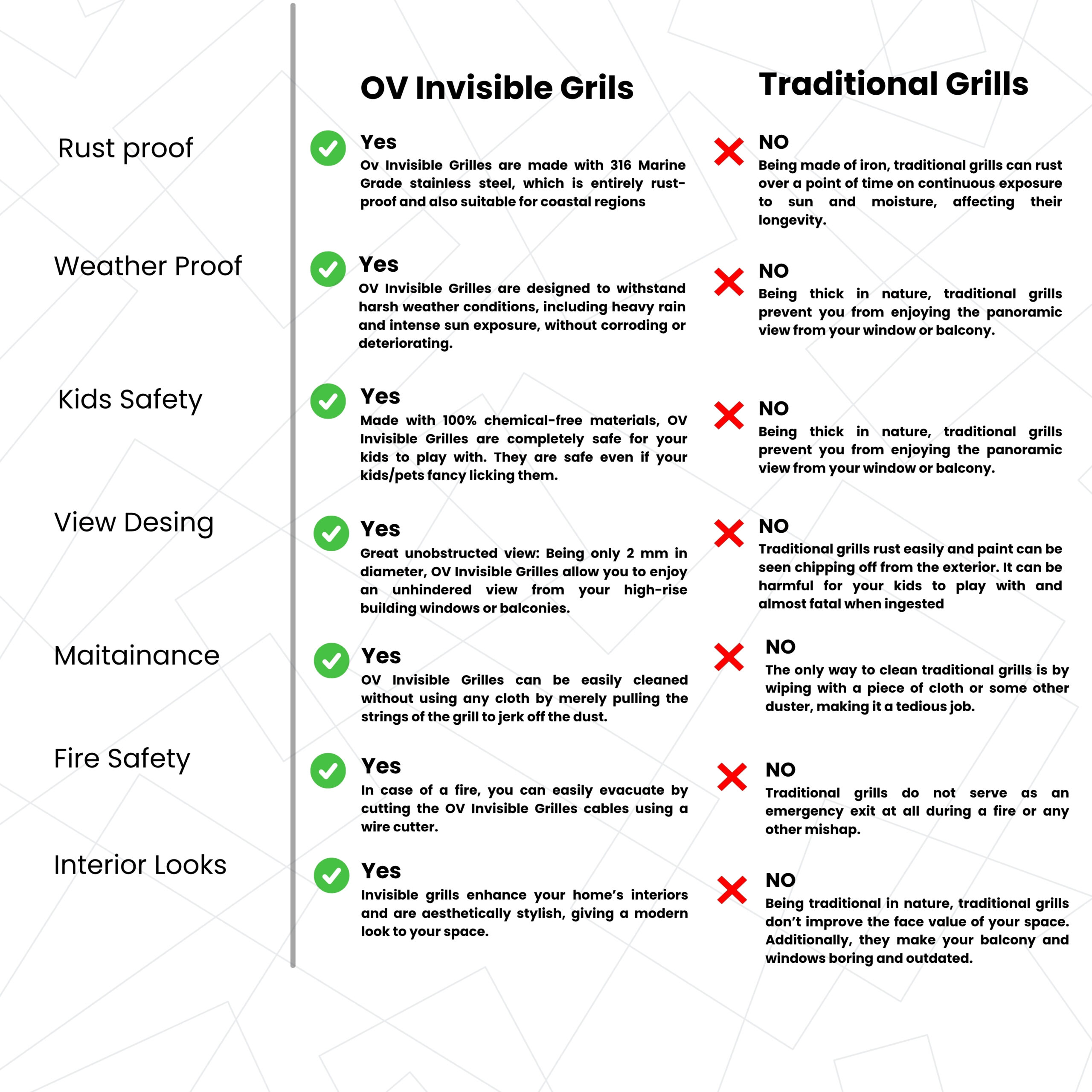 Made from high-quality, rust-proof materials, OV Invisible Grilles are built to last. They require minimal upkeep, making them a practical and cost-effective choice for long-term safety and security.